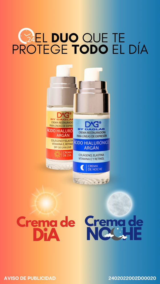 Nuestro Kit de Cremas Día y Noche, enriquecidas con ácido hialurónico, colágeno, elastina, argán y vitamina E para una piel radiante y rejuvenecida. La crema de día con SPF 50 protege contra los rayos UV, mientras que la de noche nutre intensamente.